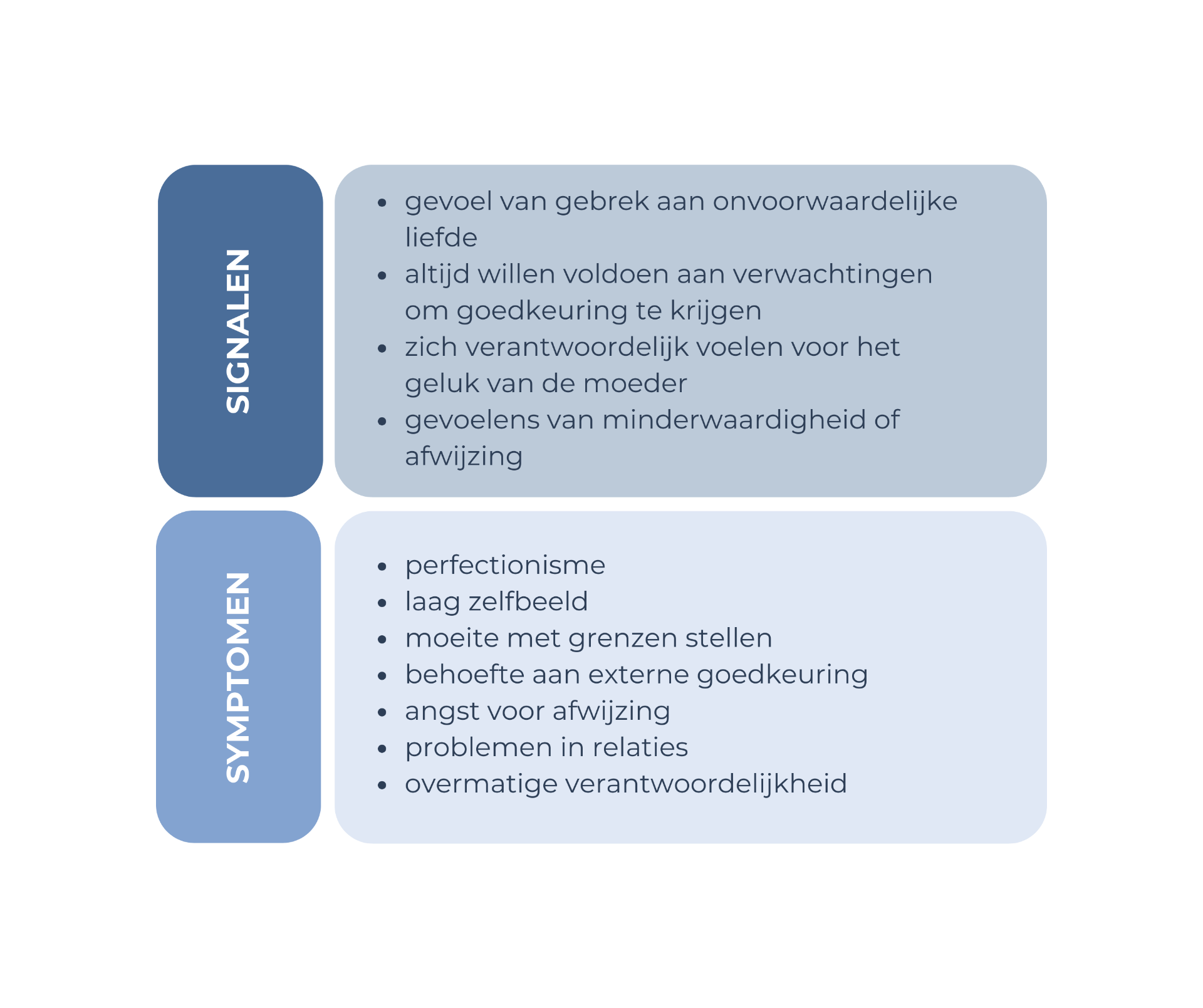 - Zich verantwoordelijk voelen voor het geluk van de moeder: de neiging om de emotionele last van anderen te dragen, een vroegtijdige rolomkering die parentificatie wordt genoemd.