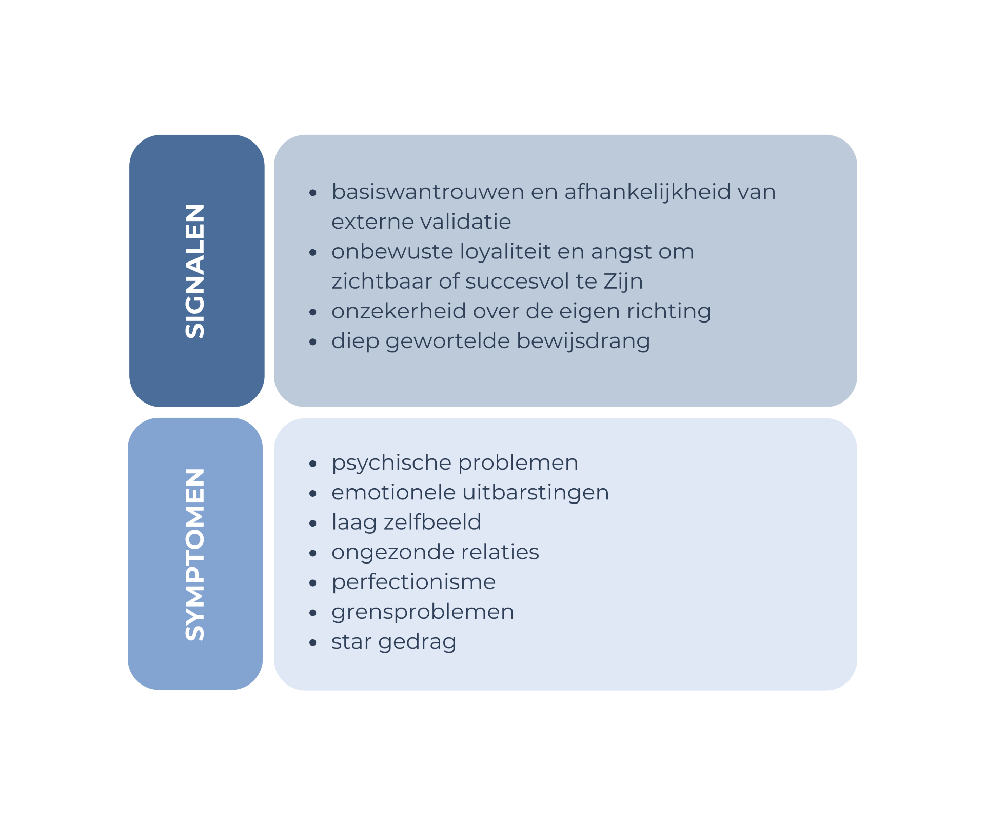 De Vaderwond is een meester in vermomming. De pijn blijft vaak onzichtbaar, maar manifesteert zich via duidelijke, hardnekkige signalen en gedrag in de volwassenheid. Deze patronen zijn in essentie een overlevingsmechanisme dat uw cliënt als kind heeft ontwikkeld om erkenning, veiligheid en (voorwaardelijke) bevestiging van competentie te garanderen.