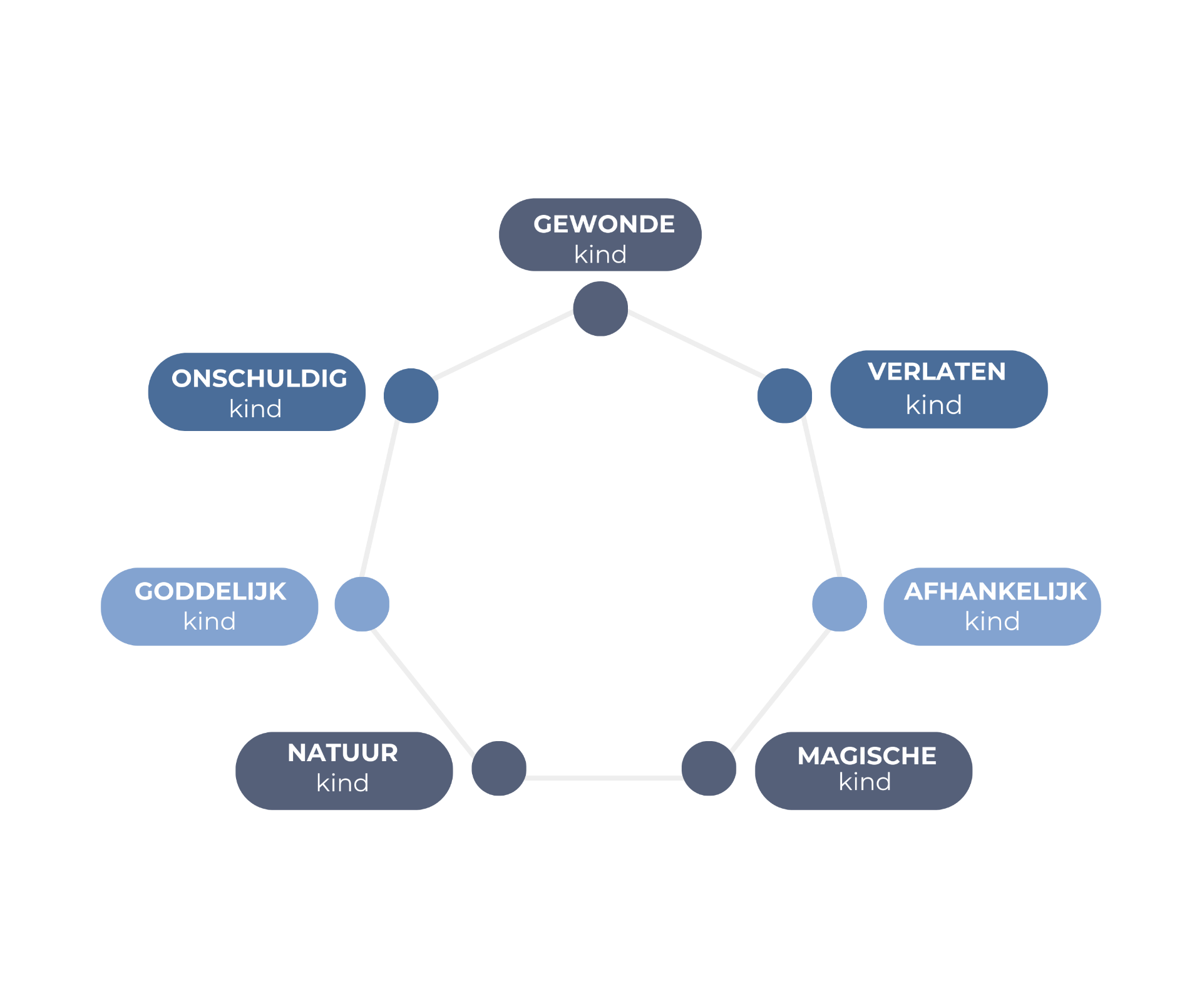 Introduceer de gedetailleerde beschrijvingen van de zeven innerlijk kind archetypen (inclusief kenmerken, behoeften, schaduwkanten). Nodig de cliënt uit om deze rustig door te nemen en te reflecteren op de herkenbaarheid en relevantie voor hun eigen ervaringen.